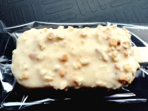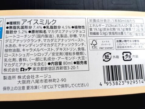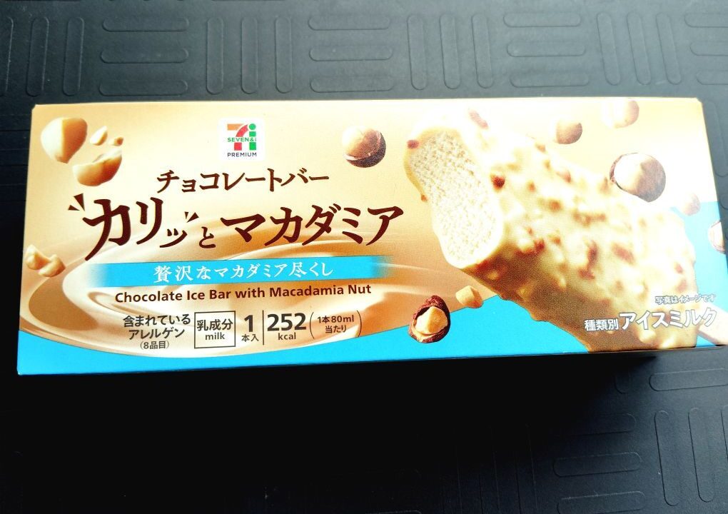 マカダミアナッツを使ってるチョコレートのアイスバーが売ってたので購入。調べてみるとマカダミアナッツ尽くしのアイスらしい。
