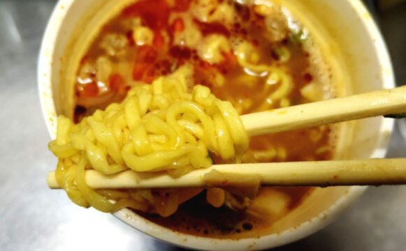 値段も170円と最近のでは高くはないカップラーメン。麺にスープがしっかり絡んで辛かった。辛い人には無理でしょうけど、激辛好きには物足りないかも。試すのはありです。