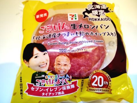 北海道のラジオ番組ごきげんようじとのコラボ商品。北海道限定らしい。さつまいも味のメロンパンですね。