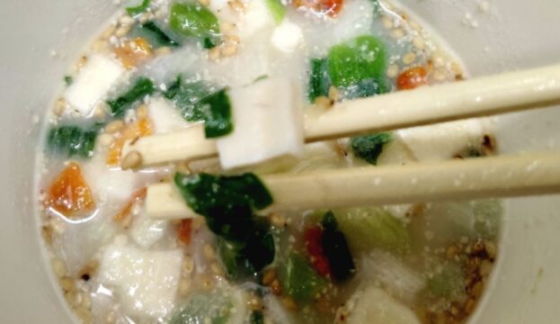 スープの素と具材を入れてお湯を注いで、良くかき混ぜて完成。味噌と豆乳の香りがいいね。美味しそう。ごまの香りもしてくる。
