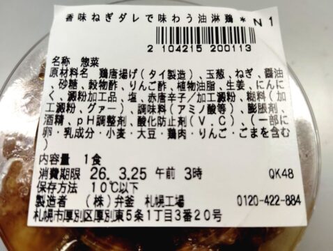 冷えててちょっと固めに感じるけど、柔らかくてジューシーな鶏肉で美味しい。香味ねぎダレの酸味とねぎがマッチして美味いね。