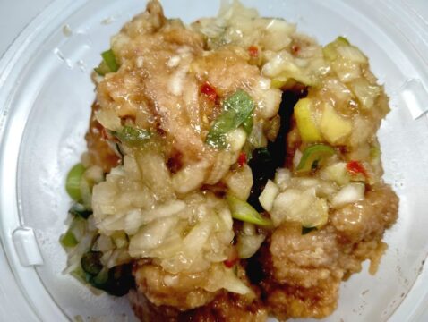 冷たくても美味しい油淋鶏。油淋鶏の香ばしさと売ってに、香味ねぎダレがマッチしてめちゃくちゃ美味しい。オススメです。
