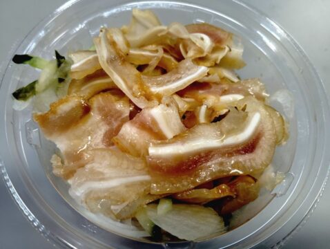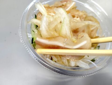 ポン酢がタップリで、たまねぎときゅうりもみずみずしくてマッチしてた。サラダ感覚で食べれるやつ。ミミガー好きならありかも。
