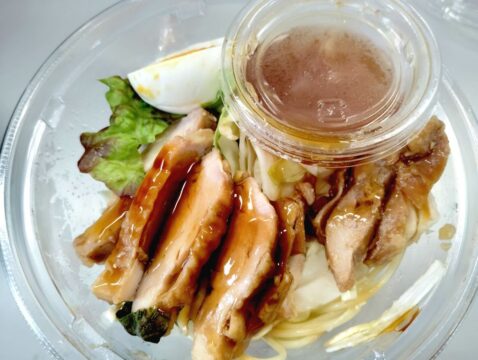 照り焼きチキンとゆで卵が美味しいパスタサラダ。和風柑橘ドレッシング付きで爽やかな味で美味しかった。
