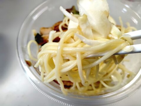 小さめな照り焼きチキンと、そこそこな野菜が入ってる。パスタはもちもち。ボリュームもそこそかあり。お試しあれ。